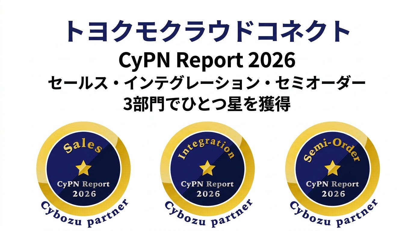 トヨクモクラウドコネクト株式会社(本社:東京都品川区、代表取締役:田里友彦)は、サイボウズ株式会社のパートナー評価制度「CyPN Report 2026」において、セールス部門、インテグレーション部門、セミオーダー部門の3部門で、それぞれ1つ星を獲得しました。CyPN Reportは、サイボウズのオフィシャルパートナーの活動実績をもとに、各領域ごとの取り組みを評価する制度です。