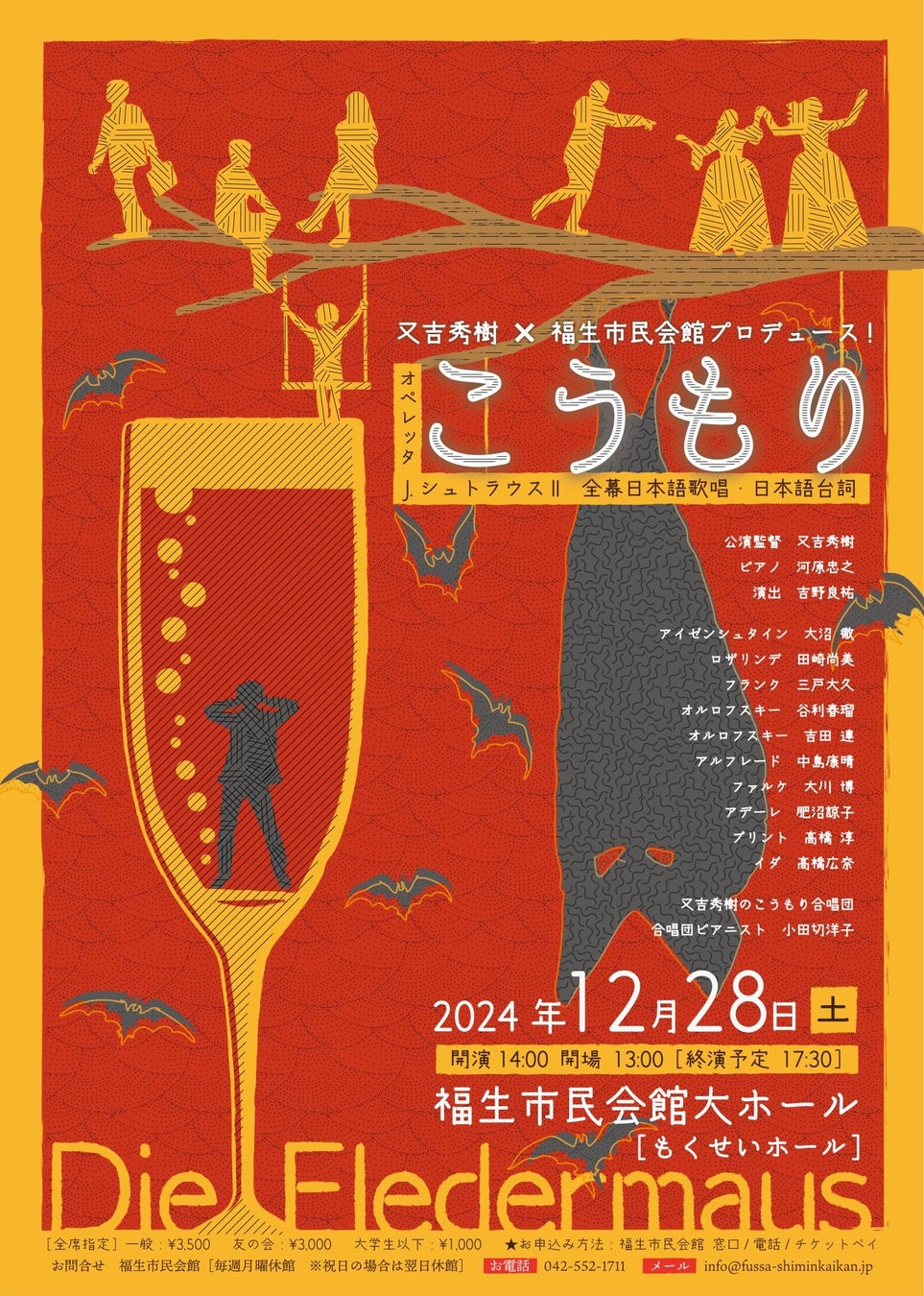 福生市出身のバリトン歌手で、福生市民会館音楽監督である又吉秀樹氏がプロデュース!ヨハン・シュトラウス二世の名作オペレッタ「こうもり」全幕を日本語上演します。第一線で活躍するオペラ歌手陣と市民合唱団とが手を携えてお届けする、極上の音楽と笑いのひととき。福生発の新しい市民オペラをお見逃しなく!