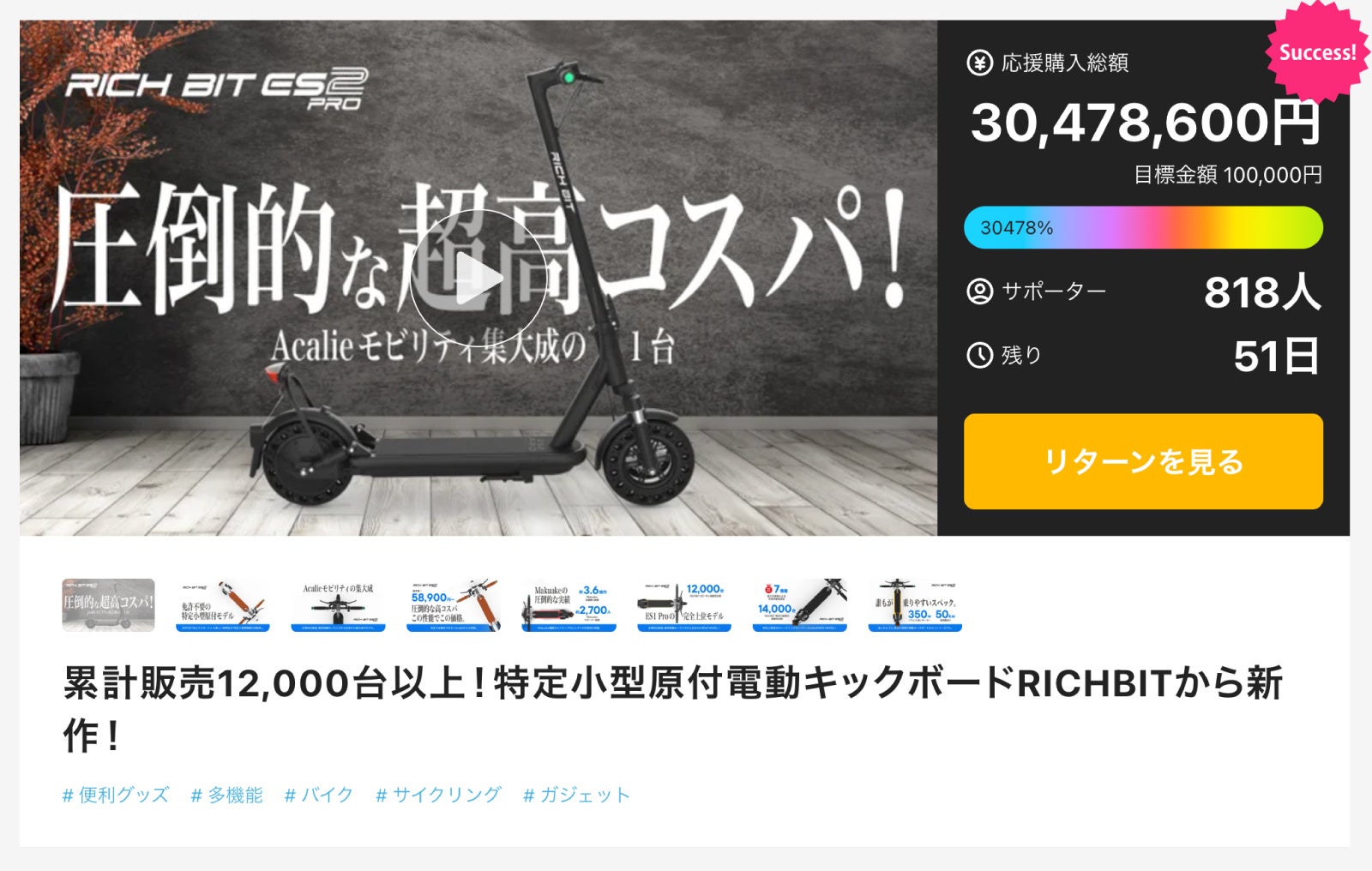 Acalie新電動モビリティ「RICHBIT ES2 Pro」はMakuakeにて2025年1月19日(日)12時より先行応援販売を開始し、初日で応援購入総額約1,800万円を達成しました。