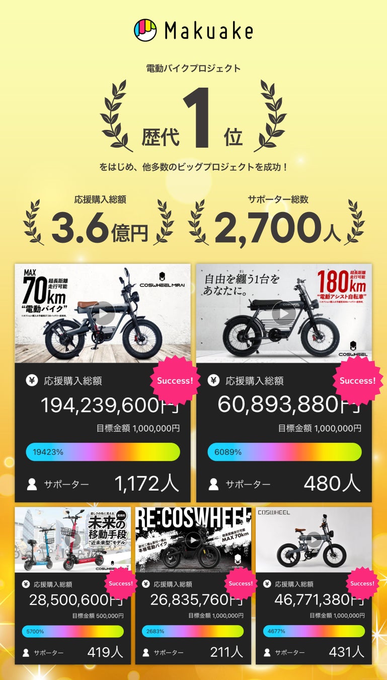 Acalie電動モビリティは、Makuake電動バイク歴代1位(自社調べ:2024年12月25日時点)のCOSWHEEL MIRAIをはじめ、多数の電動モビリティプロジェクトを成功させてきました。
