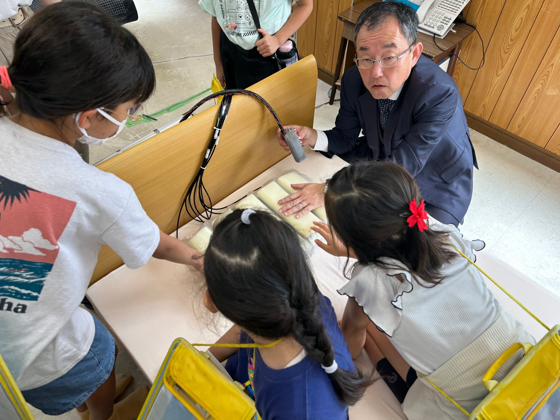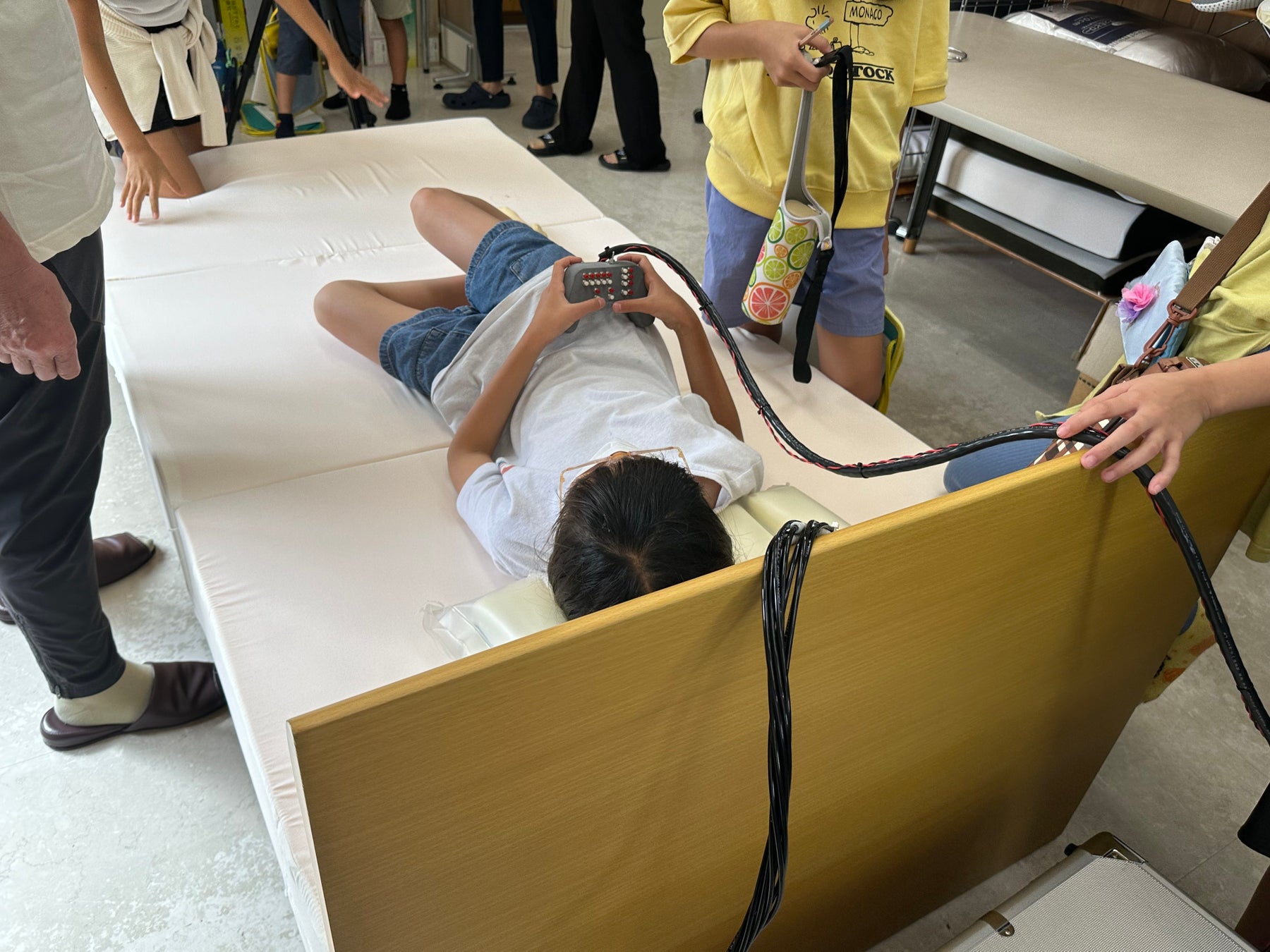 次に各種測定器を使ってまくらを開発する工程の説明を致しました。子供たちにも実際に寝心地の確認をしてもらいました。