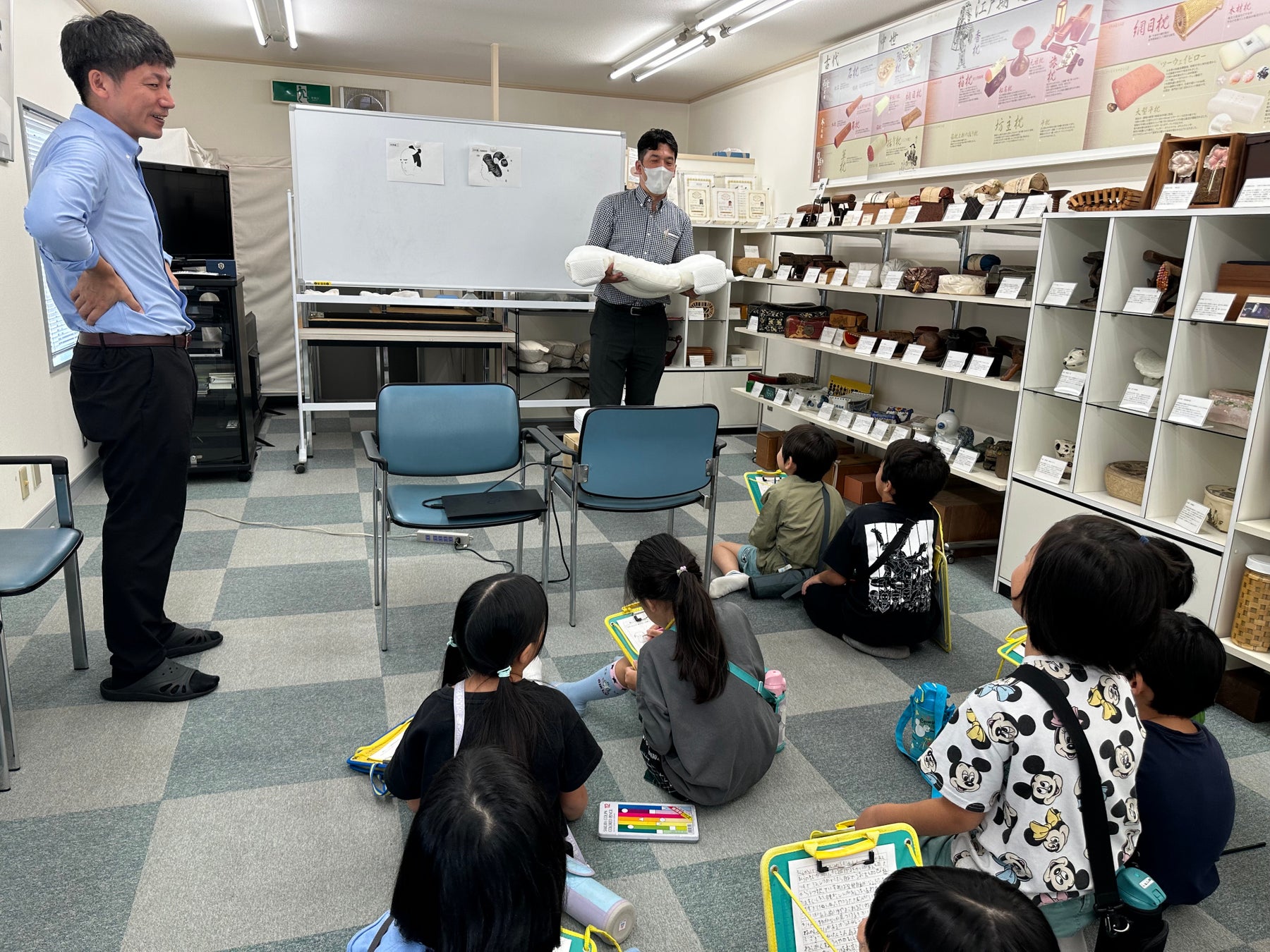 まくら博物館の歴史まくらから最新のまくらまで実際に触ってみながらどのような構造になっているのか子供たちも興味津々で聞いてくれます。