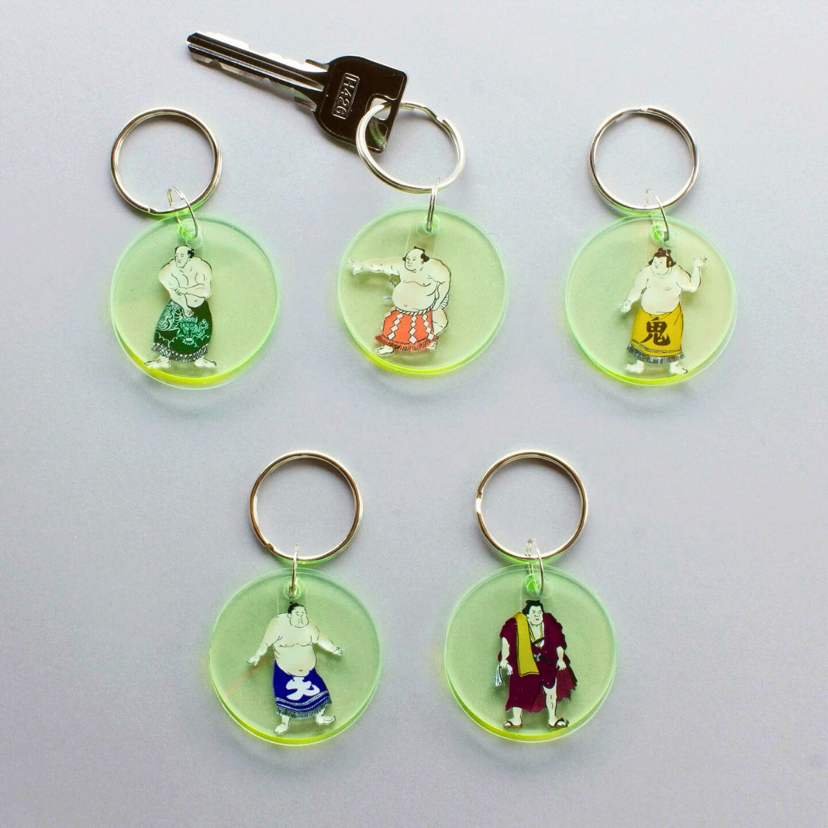 迫力満点の関取をカラフルなアクリルで挟んだ、遊び心あふれるキーホルダー。