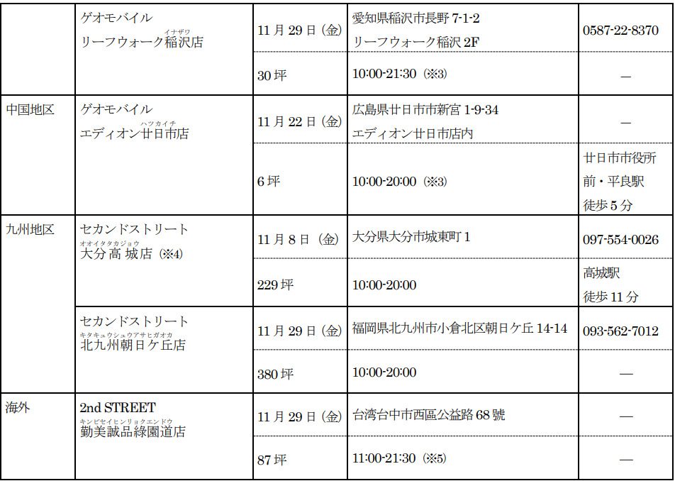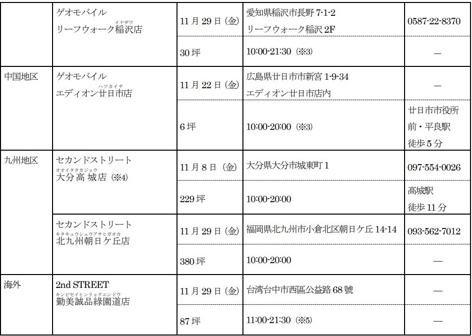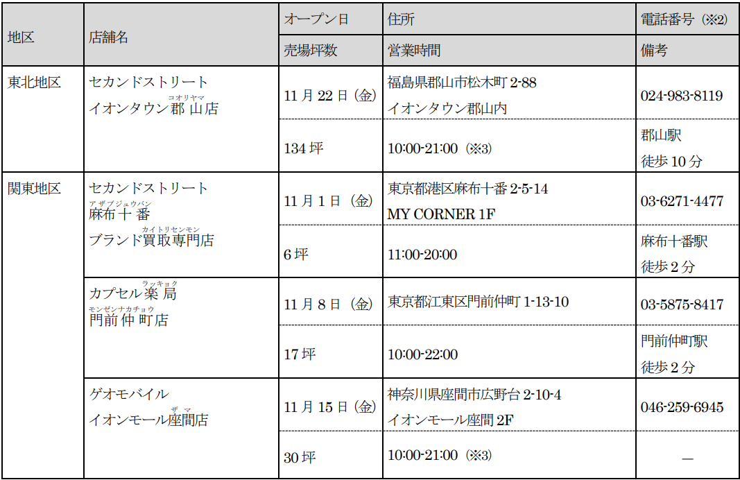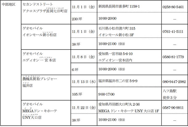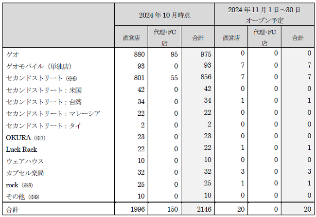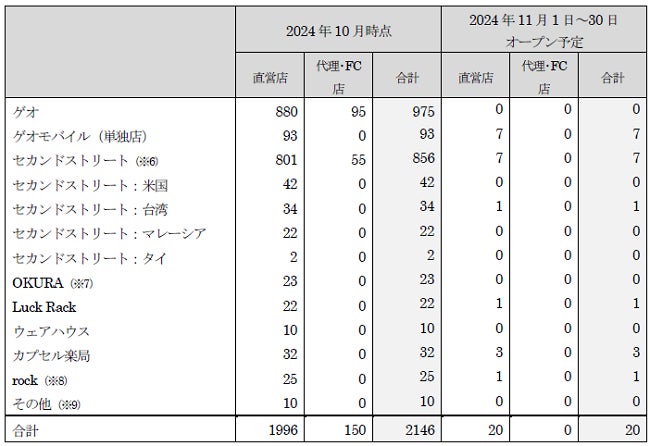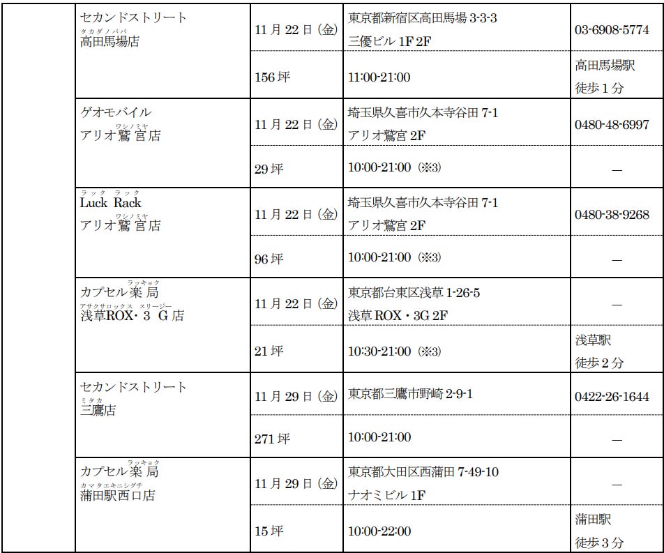新たに、「セカンドストリート」8店舗、「ゲオモバイル」7店舗、「ラックラック」1店舗、「カプセル楽局」3店舗、「農機具買取プレジャー」1店舗の合計20店が2024年度11月度にオープンします。
