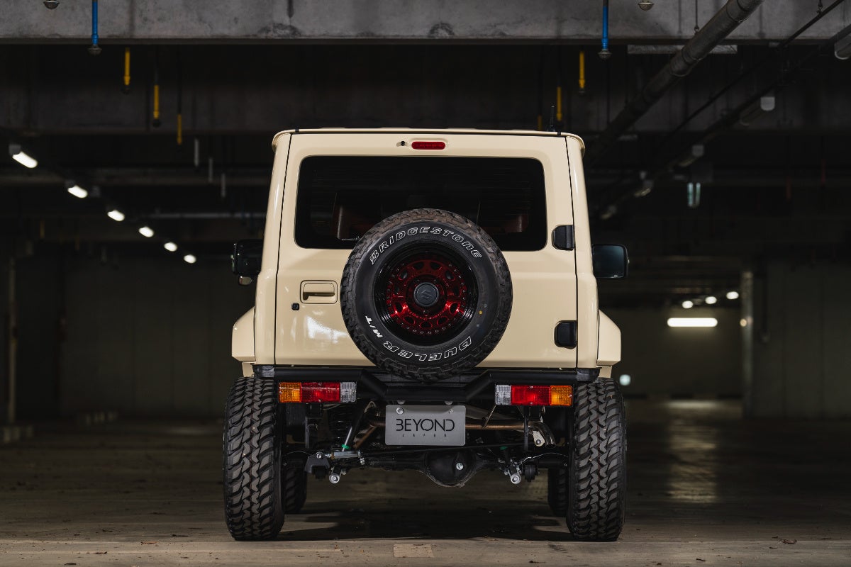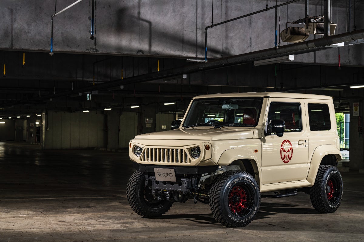 ラングラーのバッドフェイスグリルを彷彿とさせる「フェイスグリルソルジャー」と、シンプルな「バンパーレスエプロン」を組み合わせたスタイルは、ジムニーに新たな個性を与えます。