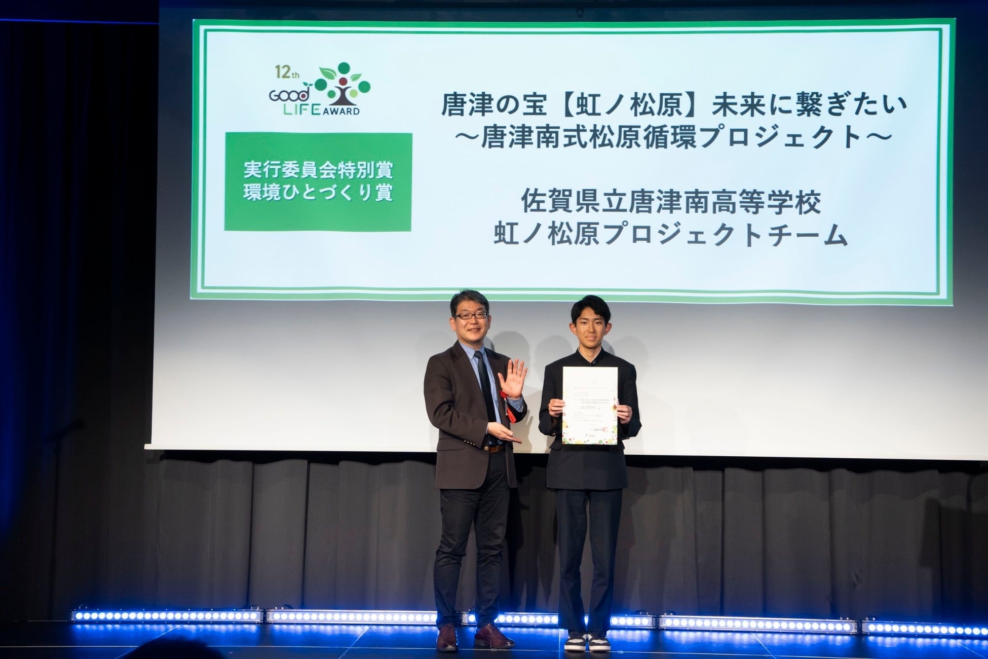 唐津南高等学校「虹の松原プロジェクトチーム」が、このたび環境省主催の「第12回グッドライフアワード」において、実行委員会特別賞 環境ひとづくり賞を受賞しました。表彰式は2024年12月7日、渋谷スクランブルホールにて開催されました。