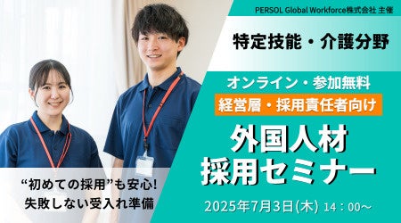 パーソルグループで外国人材に特化した人材サービスを提供するPERSOL Global Workforce(パーソル グローバルワークフォース)株式会社(本社:東京都港区、代表取締役社長:多田 盛弘)は、2025年7月3日(木)に介護事業者・医療機関向けに「外国人材採用セミナー」を開催します。外国人材採用における具体的な受入れステップを分かりやすくご説明します。なお、本セミナーはオンライン開催、参加無料です。