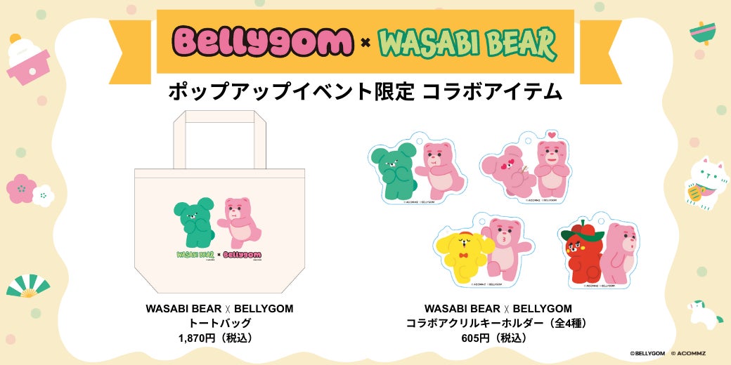 「Don‘t worry, be Belly(完璧じゃなくても、そのままで大丈夫)」を合言葉に日常に笑顔を届ける『ベリゴム』と、「体はふわふわ、心はトゲトゲ。悪い目をしたいたずらベア」をコンセプトに掲げる『ワサビベア』は、いずれも韓国でZ世代を中心に人気を集めています。今回、「韓国発のいたずら好きのクマ」という共通点を持つ2つのキャラクターが初めてタッグを組み、個性的な見た目とユニークな世界観が融合したポップアップイベントを開催します。