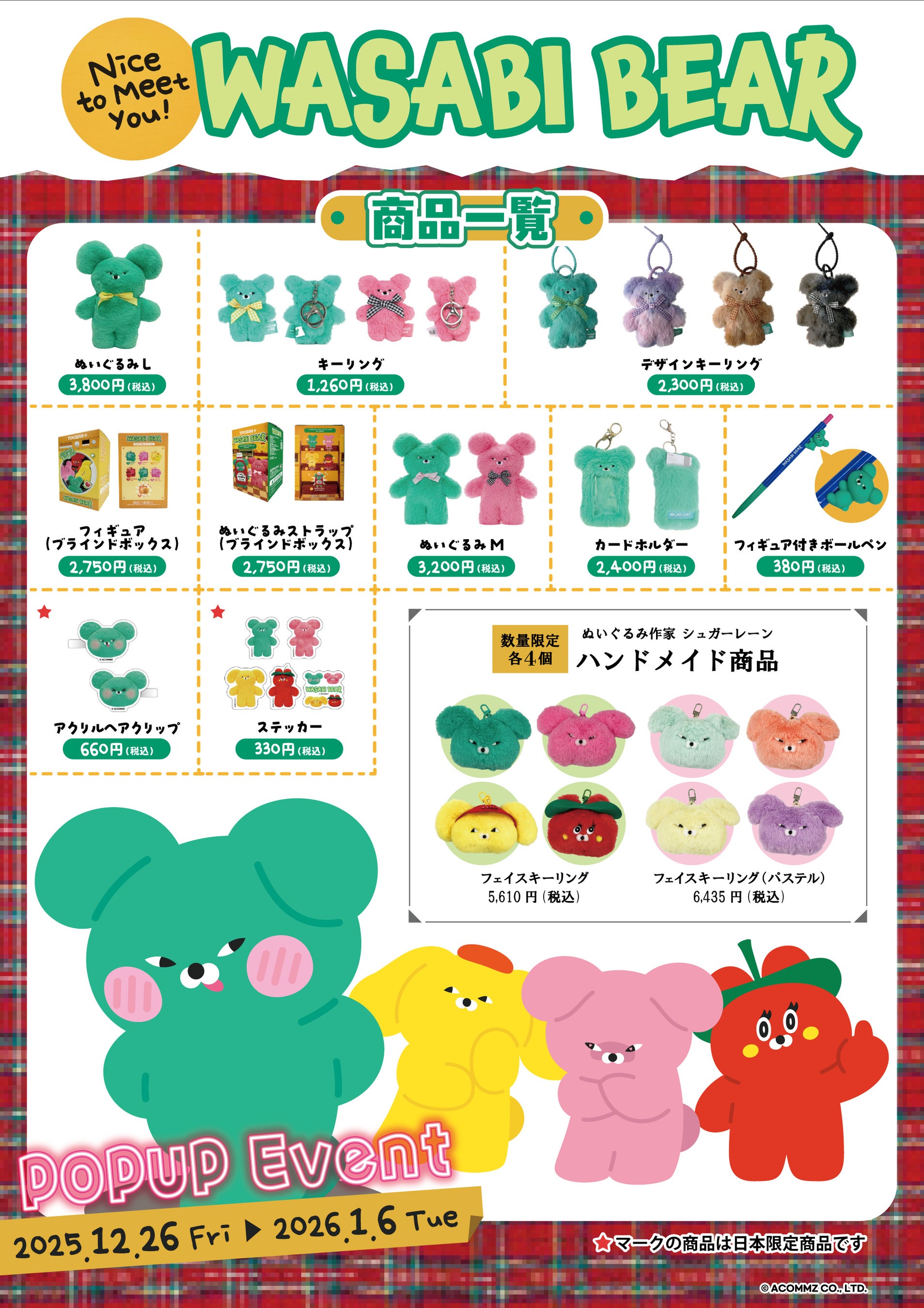今回のポップアップイベントでは、ワサビベアの生みの親であるハンドメイドぬいぐるみキャラクター作家「シュガーレーン」が手掛けたオリジナルのぬいぐるみキーチェーンも日本で初めて販売いたします。