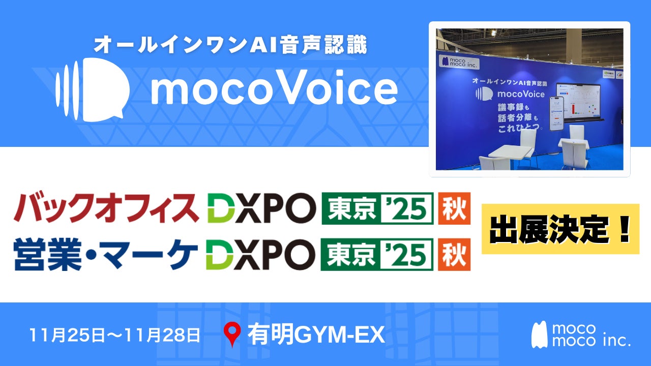mocomoco株式会社(代表取締役CEO 田中康紀、以下 mocomoco)は、オールインワンAI音声認識「mocoVoice」を、2025年11月25日(火)~28日(金)に有明GYM-EXで開催される「バックオフィスDXPO 東京秋'25」および「営業・マーケDXPO 東京秋'25」に出展いたします。