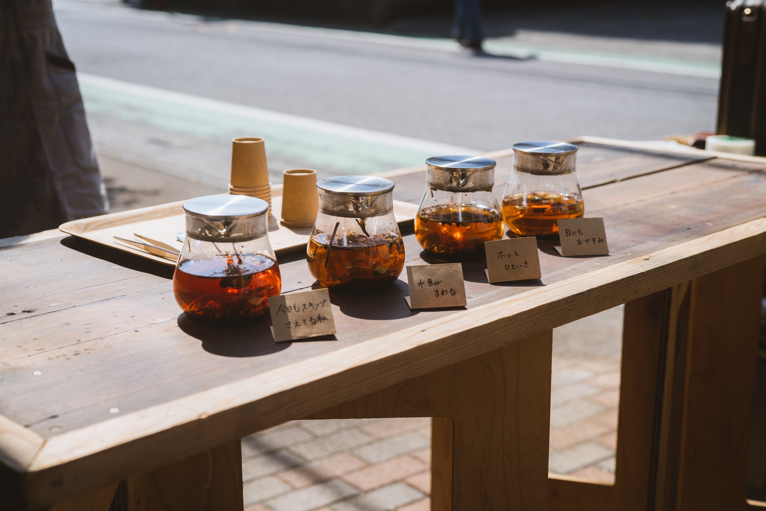 薬剤師のかたわら、休日には屋台を引いて薬膳茶を無料で提供し、他愛無い会話から悩みごとや困りごとをこぼしてもらう活動をしている石丸勝之さん。自身で調合する薬膳茶を、来訪した人に「処方」します。