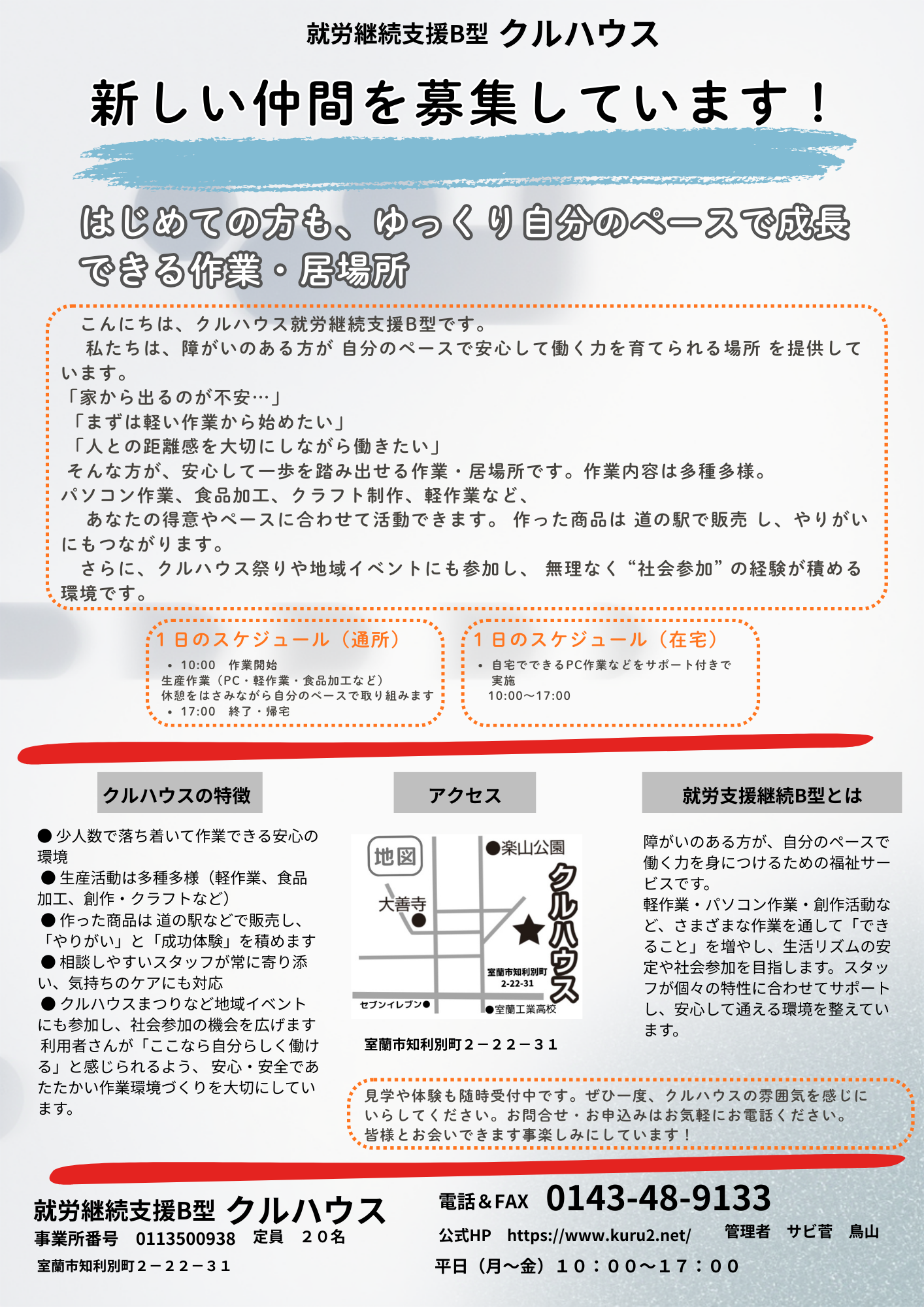 就労継続支援B型「クルハウス」は、このたび在宅支援体制を強化しました。