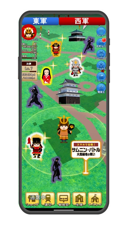 スマホアプリ「TRAIN&TRAIN(トレイントレイン)」内のイベントにて、「いえやすくん」こと徳川家康率いる「東軍」、または「ひでながくん」こと豊臣秀長率いる「西軍」に入り、歩数を稼いだり、イベント会場やその周辺のチェックポイントを巡りながら、相手の軍よりも多くのポイントを集めるゲームです。