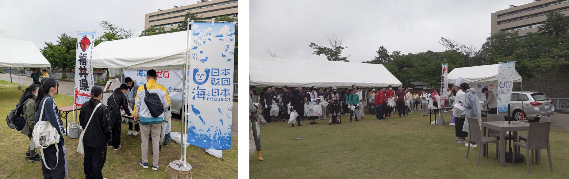 今回は昨年からさらにエリアを広げ、足羽川周辺も範囲に入れごみ拾いを実施。周辺にポイ捨てされた吸い殻が多くあった他、例年より大き目のごみも目立ちました。イベントでは、海と日本プロジェクトオリジナルごみ袋を配布し、回収したごみと引き換えに記念品をプレゼント。ごみステーションには、海洋ごみ問題訴求メッセージパネルを置き、ごみ拾い参加者へより海洋ごみ問題についての関心を深めることができました。