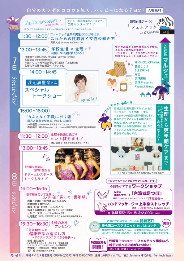 株式会社沖縄タイムス社(那覇市、瑞慶山秀彦社長)は、生理や更年期など女性特有の健康課題の解決と女性のエンパワーメントを目的に、3月7日(土)、8日(日)に、サンエー浦添西海岸パルコシティで「国際女性デー×フェムテックVol4」を開催します。