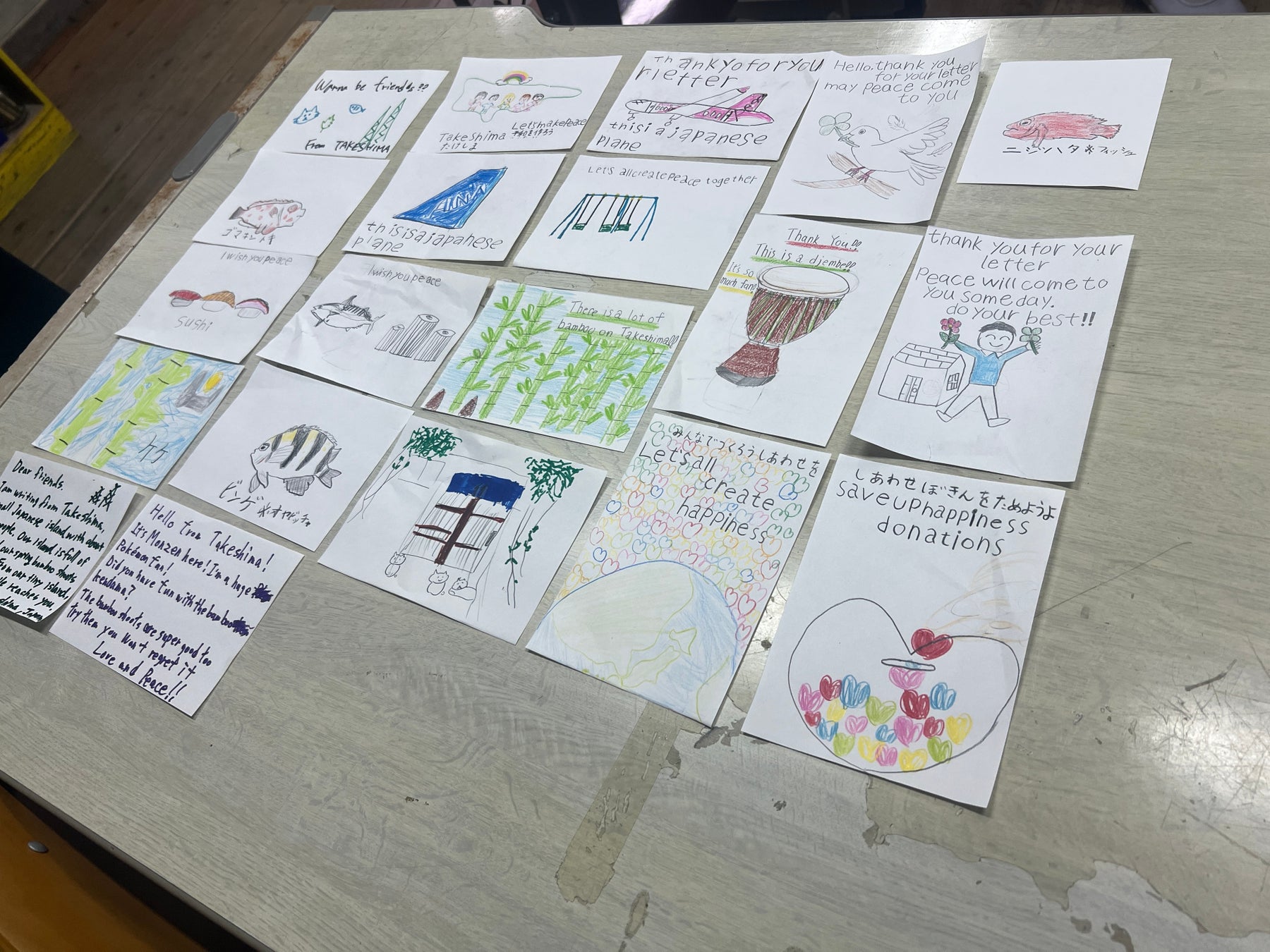 現地の子どもたちの笑顔の写真や、「平和」の文字と家の絵が描かれた手紙が映し出されると、教室は静まり返り、やがて小さなどよめきが広がりました。自分たちが心を込めて送ったものは世界の片隅に暮らす「人」に届きます。そしてその「人」は感動した想いを竹島の子ども達に伝えたいと筆を取ります。その往還をなかよし学園はつないでいます。