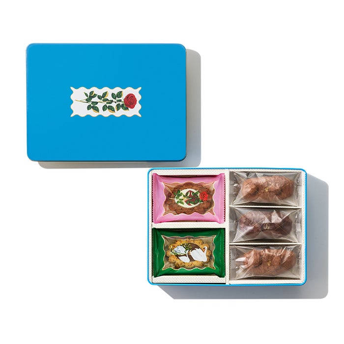 大きなナッツをのせたバターが香るクッキーをチョコレートで包み込んだショコラサブレ。国産バターでくちどけよく焼き上げた生地にチョコレートを入れた愛らしいお花のティグレ。それぞれの素材が織りなす、心ときめく味わいを上品なバラのデザイン缶に詰め合わせました。