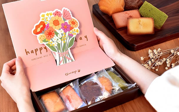 生花にあまり興味がないお母さんにも、花束が飛びだすポップアップBOXで“母の日らしさ”をしっかり演出!厳選した5種類の洋菓子で癒しのティータイムをお手伝い♪