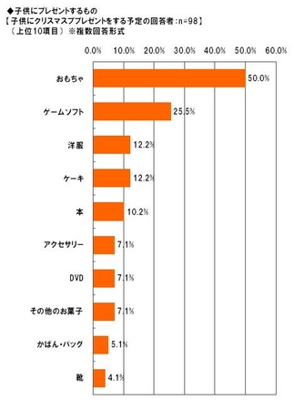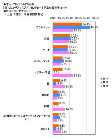 子どもにプレゼントをする予定者(98名)に、プレゼントするものを複数回答形式で聞いたところ、最も多かったのが「おもちゃ」で50%と回答者の半数となり、「ゲームソフト」が25.5%で2位となりました。3位以下の回答は10%台以下となり、子どもへのプレゼントは「おもちゃ」か「ゲームソフト」という意識が強いようです。また、恋人にプレゼントをする予定者(男性23名、女性21名)が考えているプレゼント(複数回答)は、男性では「アクセサリー」が43.5%でトップ、一方女性では同率で「アクセサリー」「マフラー・手袋」が23.8%でトップとなりました。