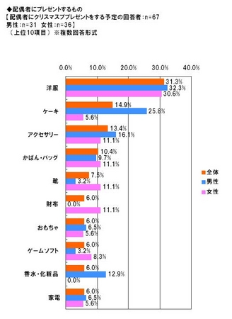 配偶者にプレゼントをする予定、またはしたいと思っている回答者(67名)に、何をプレゼントする(予定)かを、複数回答形式で聞いたところ、全体では「洋服」が31.3%でトップ、次いで「ケーキ」14.9%、「アクセサリー」13.4%が上位に入りました。「洋服」は男女ともトップとなり(男性32.3%、女性30.6%)、妻・夫には「洋服(小物含む)をプレゼント」というスタイルが主流のようです。妻へのプレゼントの2位は「ケーキ」25.8%、以下、「アクセサリー」16.1%、「香水・化粧品」12.9%となっています。夫への2位は、同率(11.1%)で、「アクセサリー」「かばん・バッグ」「靴」「財布」が並びました。クリスマスならではのケーキ以外では、やはり、普段から使えるもの、身につけるものなどがプレゼントとして多く選ばれるようです。