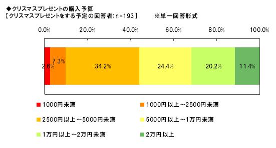 クリスマスプレゼントを贈る予定の人、したいと思っている人(193名)に、予算の目安を聞いたところ、「2500円~5000円未満」が34.2%、「5000円~1万円未満」が24.4%と多くなっており、「1万円~2万円未満」は20.2%、「2万円以上」は11.4%となっています。5000円未満が44.1%となっていることから、多くの人が気軽にクリスマスプレゼントを渡す傾向がみてとれます。