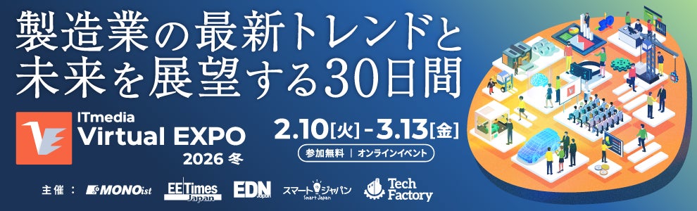 アイティメディア株式会社(本社:東京都千代田区、代表取締役社長 兼 CEO:小林教至、以下アイティメディア)は、2026年2月10日(火)~ 3月13日(金)に「ITmedia Virtual EXPO 2026 冬」を開催します。本イベントは、「MONOist」「EE Times Japan」「EDN Japan」「スマートジャパン」「TechFactory」の5媒体が主催する製造業向けのオンライン展示会で、事例紹介や専門家の講演といった多様なコンテンツを通じて、製造業の課題解決やモノづくりのプランニングに役立つヒントをお届けします。