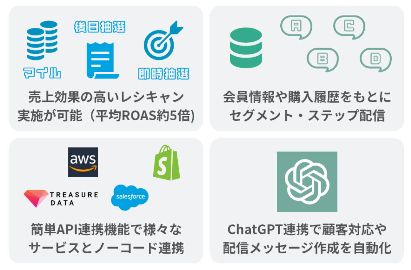 また、LINE公式アカウントの友だち集客後のCRM機能も実装し、「一人ひとりの行動や属性に合ったメッセージ配信」「QRコードなど媒体別に友だち追加経路を分析」など、LINE公式アカウントでの顧客管理や、配信・運用を自動化することも可能です。
