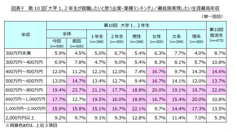 なお、2024年5月に就活生を対象に実施した「第10回 就職したい企業・業種ランキング」の主な回答層が「400万円~800万円」でした。これを踏まえると、大学1、2年生の方が高額な年収を希望していることが分かります。(図表F)
