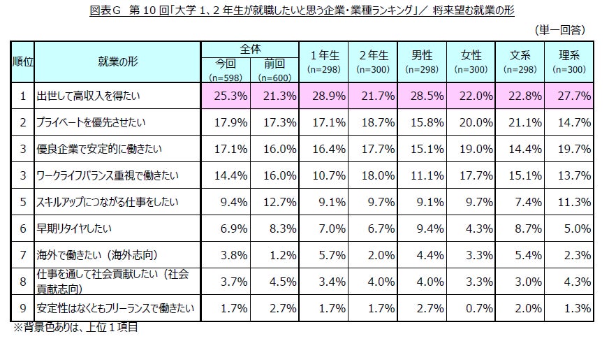 「出世して高収入を得たい」については、学年別・性別・文理別のすべてで1位を占め、特に「1年生」(同28.9%)と「男性」(同28.5%)では、2位の「プライベートを優先させたい」との差が10ポイント以上高い回答率となっています。(図表G)