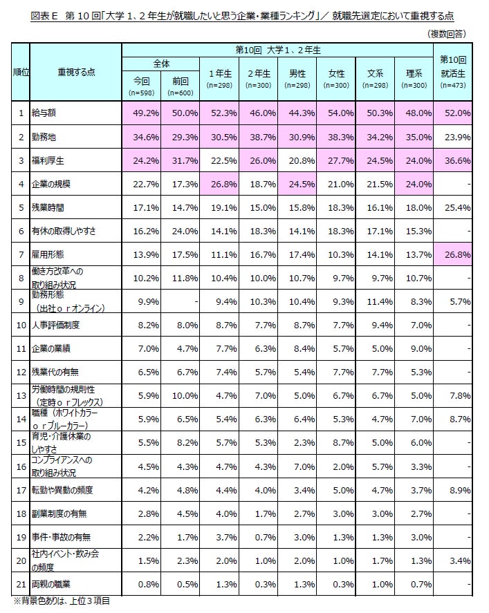 就職先の選定において重視する点としては、1位が「給与額」(回答率49.2%)、2位が「勤務地」(同34.6%)、3位が「福利厚生」(同24.2%)でした。上位3項目は、前回と同じ順位で、大きな変化はありません。また、今回新たに加えた「勤務形態(出社orオンライン)」(同9.9%)は全体で9位となり、気にする学生は1割程度に留まりました。(図表E)