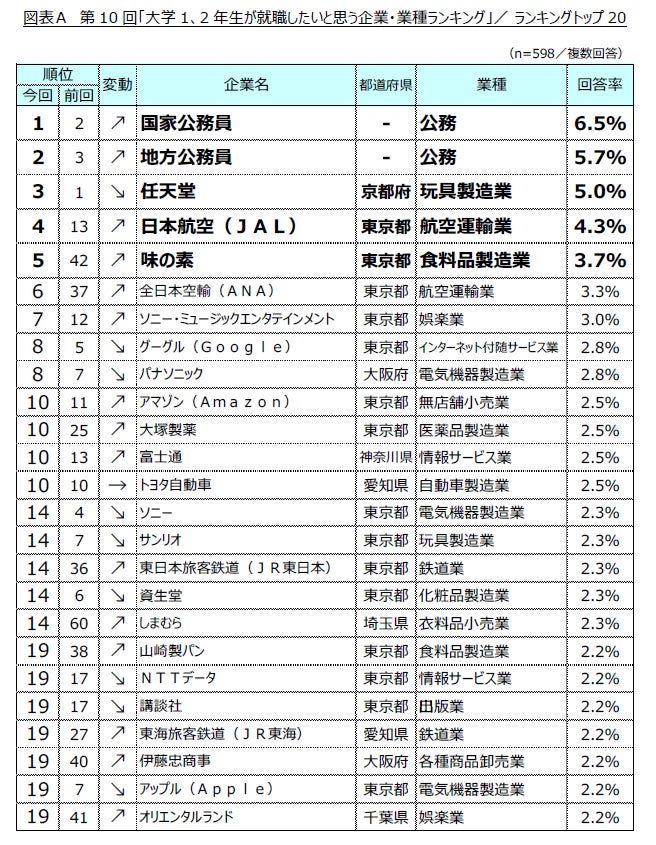 第10回「大学1、2年生が就職したいと思う企業・業種ランキング」調査 ~公務員がTOP2を奪還!文系はエンタメ企業、理系は製造業が人気~
