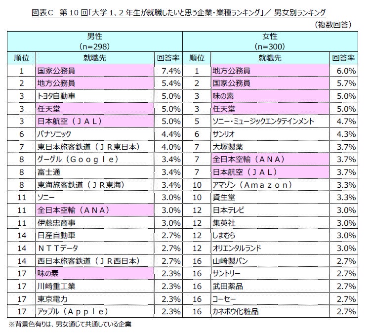 男女別の集計では、男性の1位は「国家公務員」(回答率7.4%)で、前回1位の「任天堂」(同5.0%)は3位となりました。「東日本旅客鉄道(JR東日本)」、「東海旅客鉄道(JR東海)」、「西日本旅客鉄道(JR西日本)」や「日本航空(JAL)」、「全日本空輸(ANA)」など、交通インフラ業界の人気が高い傾向が表れました。