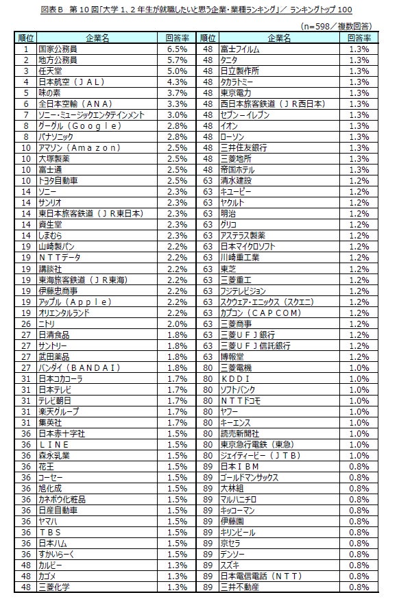 ●本ランキング1位は「国家公務員」、2位「地方公務員」、3位「任天堂」となりました。前回調査で9回連続トップ2独占から外れた公務員が、今回再びトップ2を奪還しました。