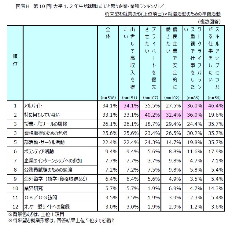 また、将来望む就業形態と、就職活動のための準備活動の関係性を集計したところ、「スキルアップにつながる仕事がしたい」と考える学生のうち、「特に何もしていない」と回答した割合は20%を下回り、目的意識をもって活動する傾向が見られました。一方で、他の就業形態を望む学生においては、3~4割が「特に何もしていない」と回答しており、具体的な取り組みをイメージできていない様子がうかがえます。(図表H)
