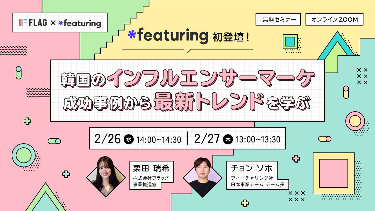 マーケティングコミュニケーションの総合プロデュースを担う株式会社フラッグ(本社:東京都渋谷区、代表取締役:久保浩章、以下、当社)は2025年2月26日(水)、27日(木)に、インフルエンサーマーケティングサービスを提供する韓国企業「フィーチャリング社」(代表:チャン・ジフン)と共同で、インフルエンサーマーケティングの活用を検討している事業主・広告代理店様などを対象とした無料ウェビナーを開催いたします。