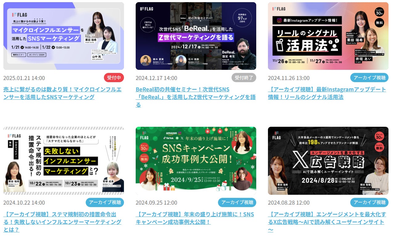 フラッグは最新のソーシャルメディアマーケティングの最新事例、ソーシャルメディアの活用方法などを中心に、マーケティング・プロモーション担当者の方々に向けの無料セミナーを定期開催しています。