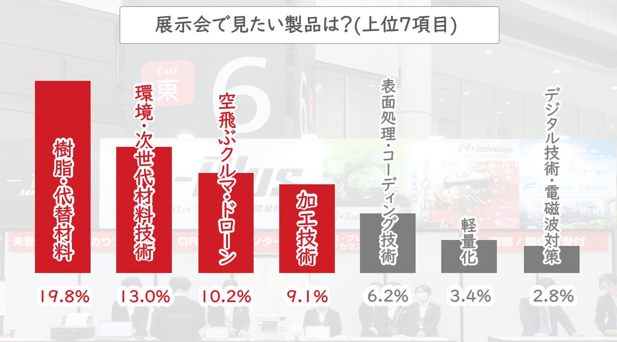 来場者は幅広い製品・技術をご覧になりたいことが明らかになりました。特に、「樹脂・代替材料」「環境・次世代材料技術」「空飛ぶクルマ関連」「加工技術」が多い結果となりました。