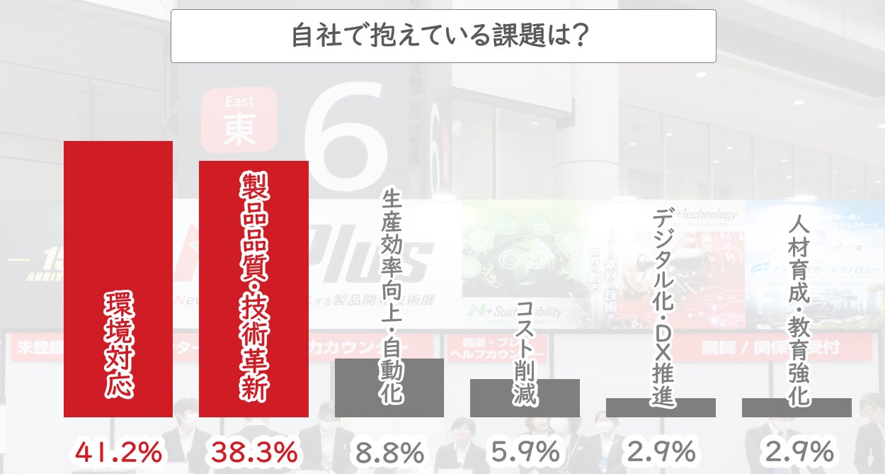 「環境への対応」や「製品品質・技術革新」に課題を抱えている割合が高いことが分かります。また、人手不足を背景に「生産性向上、デジタル化、人材育成」といった課題に悩まれている方も一部明らかになりました。