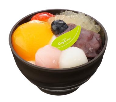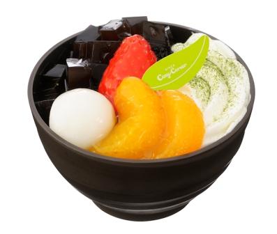 黒糖ゼリーに抹茶スポンジ、ふわふわ生クリームムースを重ねて、フルーツや白玉、粒餡ゼリーを彩りよく飾りました。フルーツの酸味に、ムースと和素材のやさしい甘みが絶妙に調和しています。