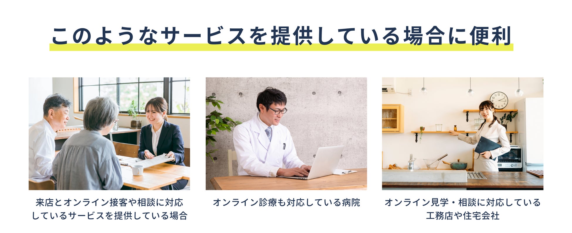今回追加された新機能は、オンライン接客とリアル店舗での接客対応しているサービスを提供しているリテール店舗や、オンライン診療にも対応している病院、オンライン見学や相談にも対応している工務店や住宅会社等に便利な機能です。