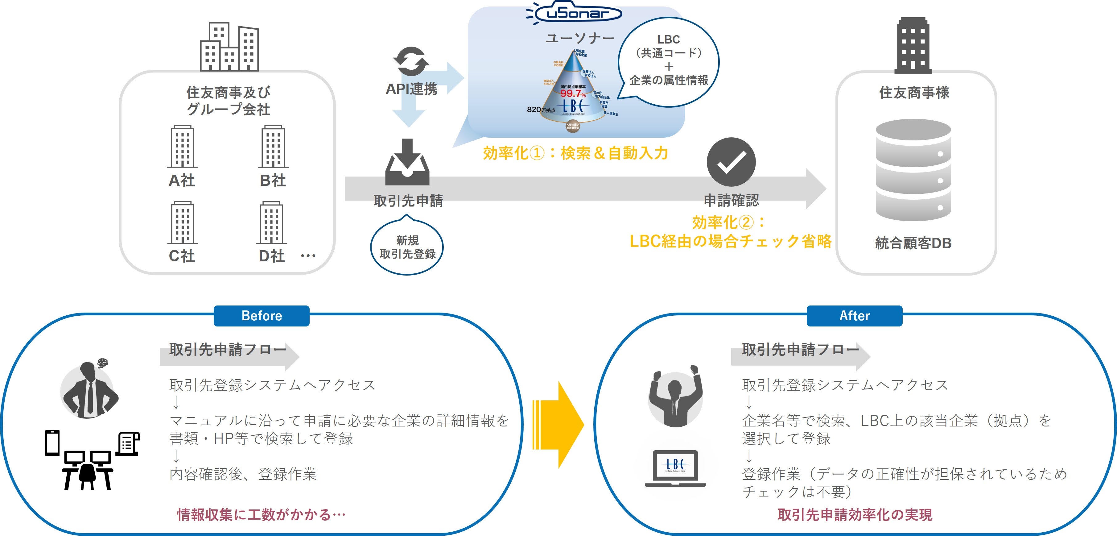 ユーソナーの法人企業データベースは、独自コードLBCで国内820万の事業拠点を網羅した国内最大級の法人企業データベースです。住友商事様の取引先DBにLBCを紐づけることで、取引先の登録申請に関する業務が格段に速くなりました。今後、住友商事および住友商事グループ標準ERPを利用する26社において、業務の効率化が進む予定です。