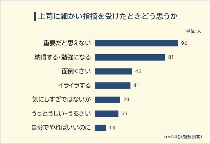 上司に細かい指摘を受けたときにどう思うかを聞いたところ。「重要だと思えない(96人)」と答えた人がもっとも多くなりました。