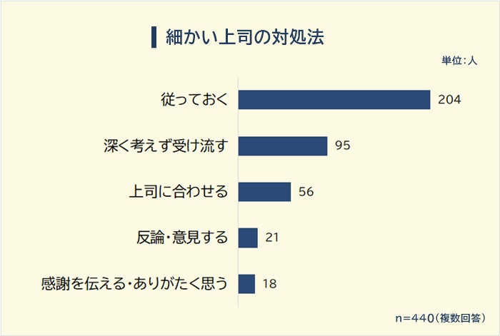 「細かい上司の対処法」を聞いたところ、もっとも多かった回答は「従っておく(204人)」でした。2位「深く考えず受け流す(95人)」、3位「上司に合わせる(56人)」が続きます。