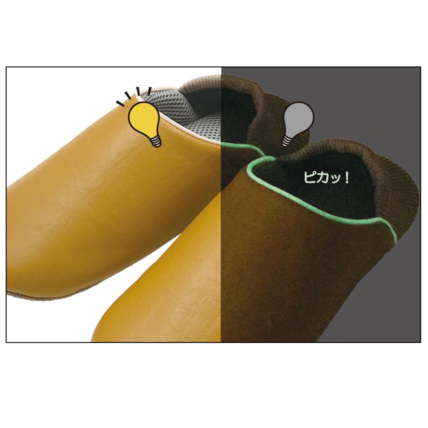 蛍光灯などの光を吸収し、暗闇で発光する蓄光テープがスリッパの履き口についています。