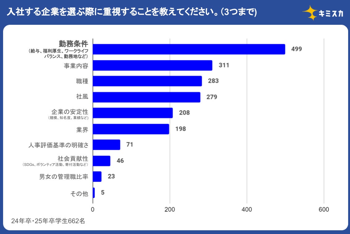 勤務条件(給与、福利厚生、ワークライフバランス、勤務地など)が1位で75.4%をしめていることからも、多くの学生が安定性を求めていることが分かる。