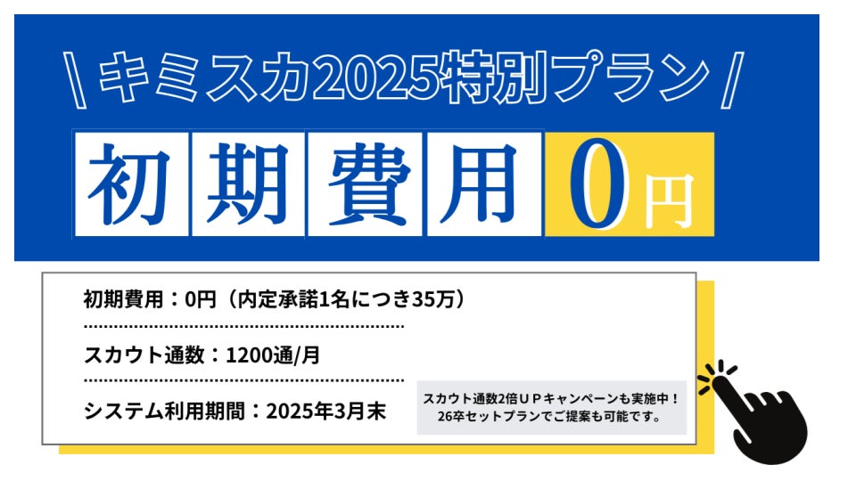 また、キミスカ2025(25年卒向け)を対象として2024年3月1日より初期費用0円の本選考プランを提供しておりますので、ご検討の際は下記よりお問い合わせください。