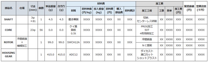 部品構成表ベースに、材料費(単価 x 使用量)、加工費(工法: 工数 x 賃率)、型治工具費等の見積結果を提供致します。