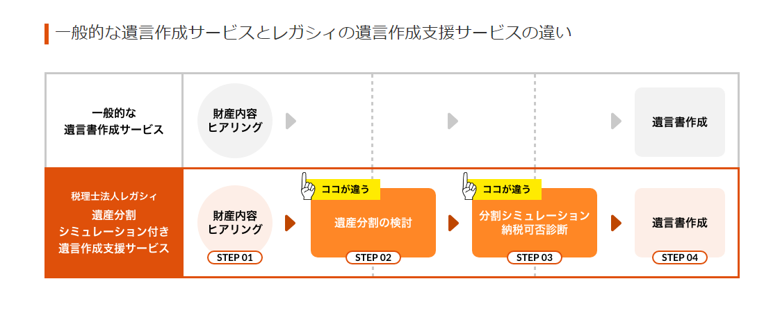 一般的な遺言作成サービスでは、財産内容のヒアリングをして遺言書を作成するだけとなっております。しかし、これだけでは遺産分割の検討が十分になされていなかった場合には後で揉め事になってしまうリスクや、遺産相続後に納税できなくなってしまうというリスクがあります。