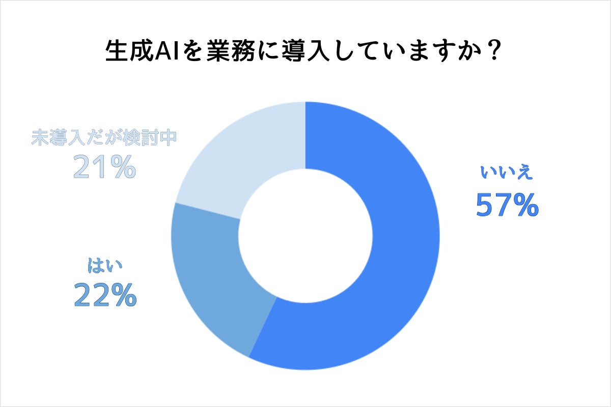 生成AIを業務に導入している企業は22%でした。MicrosoftとLinkedInが公開した32%という数値に比べ10%低い結果です。また、2023年にJetB株式会社が調査した際は24%であり、同条件での調査結果を比べても、1年間で導入率は2%減少しています。
