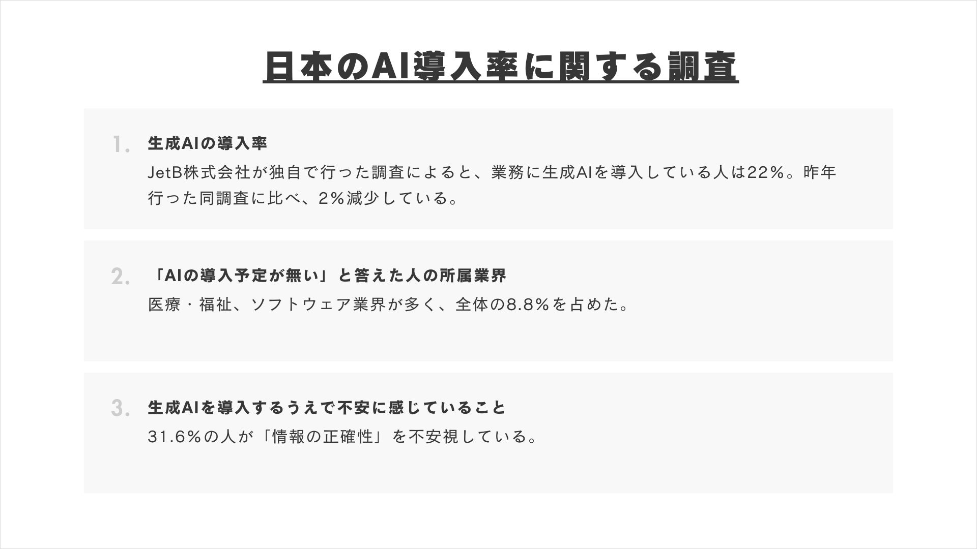こうした課題を受け、JetB株式会社では、日本企業のAIに対する認識や業種別の活用状況を把握するための調査を実施しました。調査結果をもとに商品の開発やAI導入支援サービスの改善を行い、多くの企業にAIを活用してもらうことを目的としています。